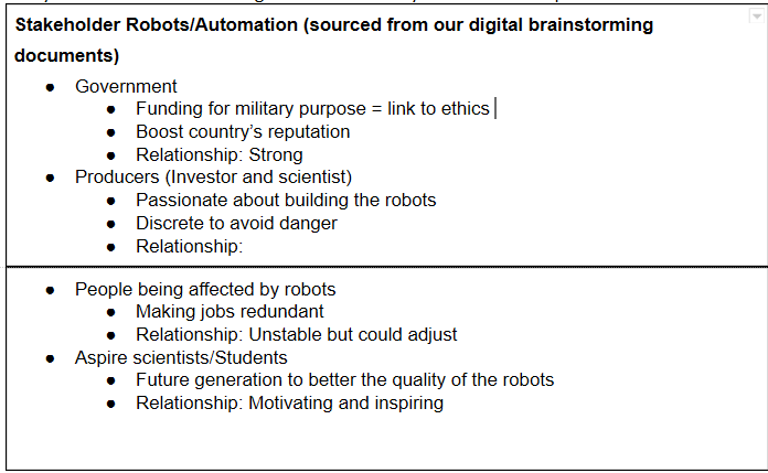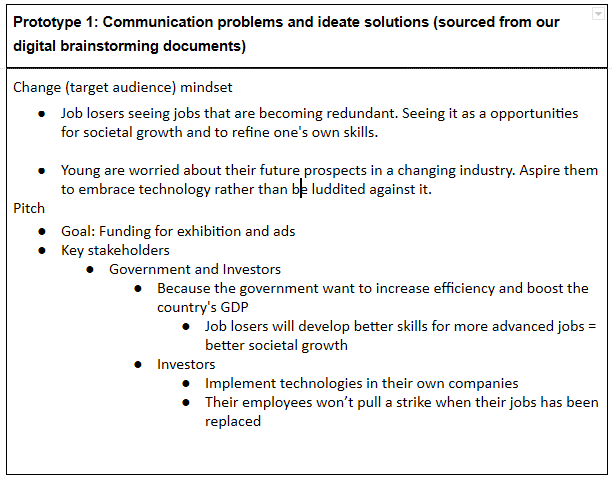 Our second brain storm, we shifted our perspectives and interests away from industry and governmental bodies and began thinking about representing the middle working class, young people (16 to 22) and technology sceptics – the target audience later changed to 16 to 20. Our purpose shifted away a financially driven objective to an awareness objective. We hope to establish a campaign that would address the fear of future unemployment.